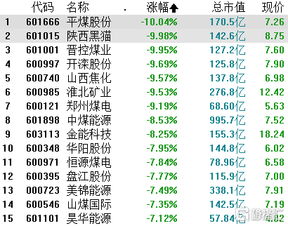 煤炭相关板块也全线下挫,跌5.85%。平煤股份跌停,陕西黑猫、山西焦化、郑州煤电等跌逾9%,中煤能源、金能科技等跌超8%,相关个股全线走低。