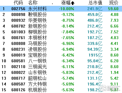 钢铁板块亦大幅回调,永兴材料跌停,鞍钢股份、华菱钢铁等跌超8%,宝钢股份大跌6.42%,方大特钢、南钢股份等跌超5%。