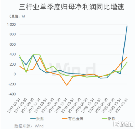 业绩方面,采掘、有色金属、钢铁三大板块变现均较为亮眼。单季度业绩同比呈现快速增长的态势,部分行业增速甚至创出近年来新高。其中,采掘、有色金属、钢铁行业2021年一季度同比增速分别为968%,344%和240%。采掘行业一季度归母净利润644亿元,为2017年以来次高;有色金属行业归母净利润197亿元,创2017年以来新高;钢铁行业归母净利润265亿元,亦为2017年以来高位水平。